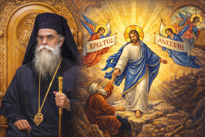 Ὁ Χριστὸς ἐκρεμάσθη ἐπὶ τοῦ Σταυροῦ· ἡ γῆ ἐσκοτίσθη, οἱ καρδιὲς λύγισαν, ἡ ἐλπίδα ἐτάφη. Μὰ Ἐκεῖνος ἀνέστη. Κατῆλθε ἕως τὰ κατώτατα τῆς γῆς, συνέτριψε τὰ δεσμὰ τοῦ Ἅδου καὶ ἠγέρθη «ὡς κραταιὸς ἐν πολέμῳ». Ὁ θάνατος κατεπόθη. Ἡ ζωὴ ἀναγεννήθηκε, διότι ὁ Χριστὸς ἀνέστη.